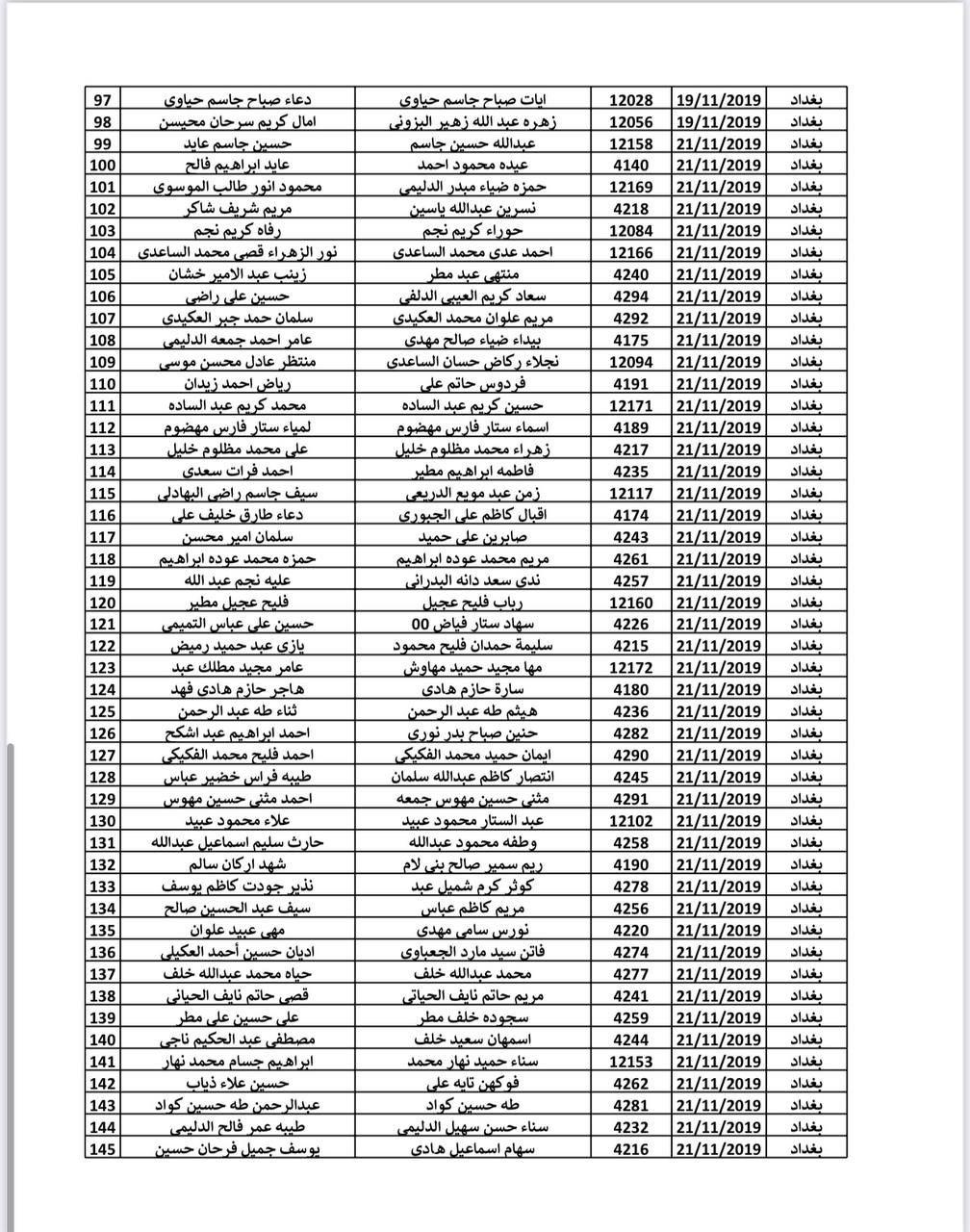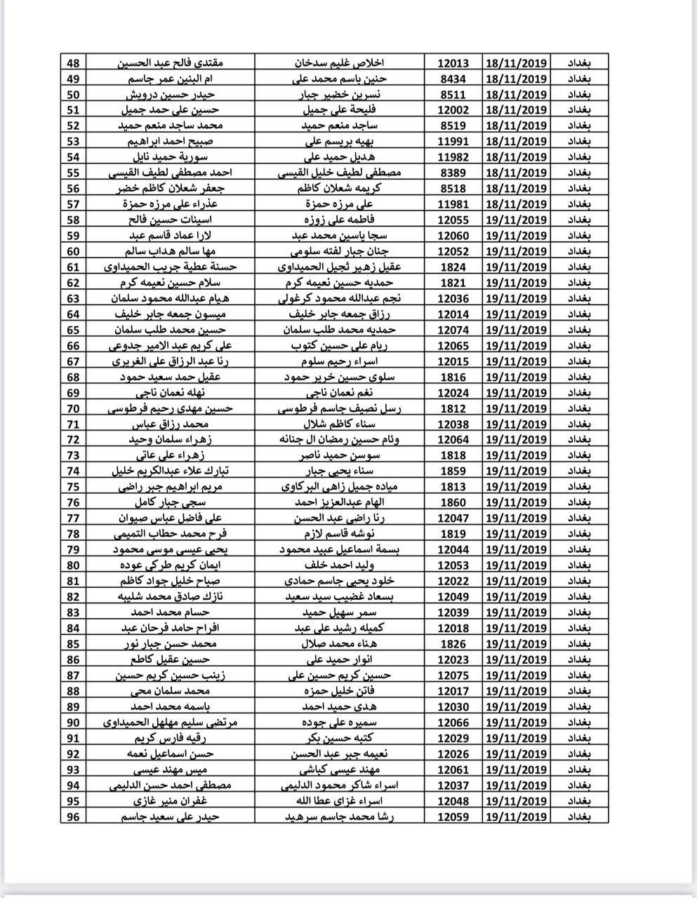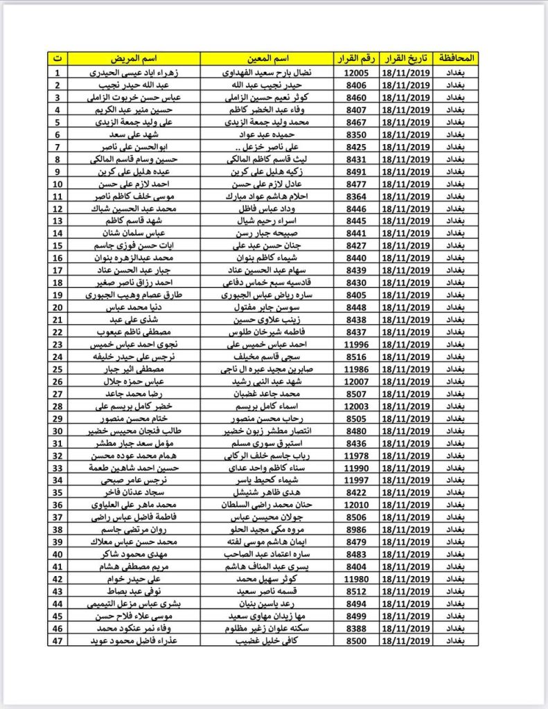 أعلنت هيئة حقوق ذوي الإعاقة والاحتياجات الخاصة في وزارة العمل والشؤون الاجتماعية عن إطلاق الوجبة الثامنة والخمسين (58) من أسماء المواطنين المشمولين بإجراءات المشاهدة السنوية من أصحاب القرارات الطبية لعام 2019 في العاصمة بغداد.