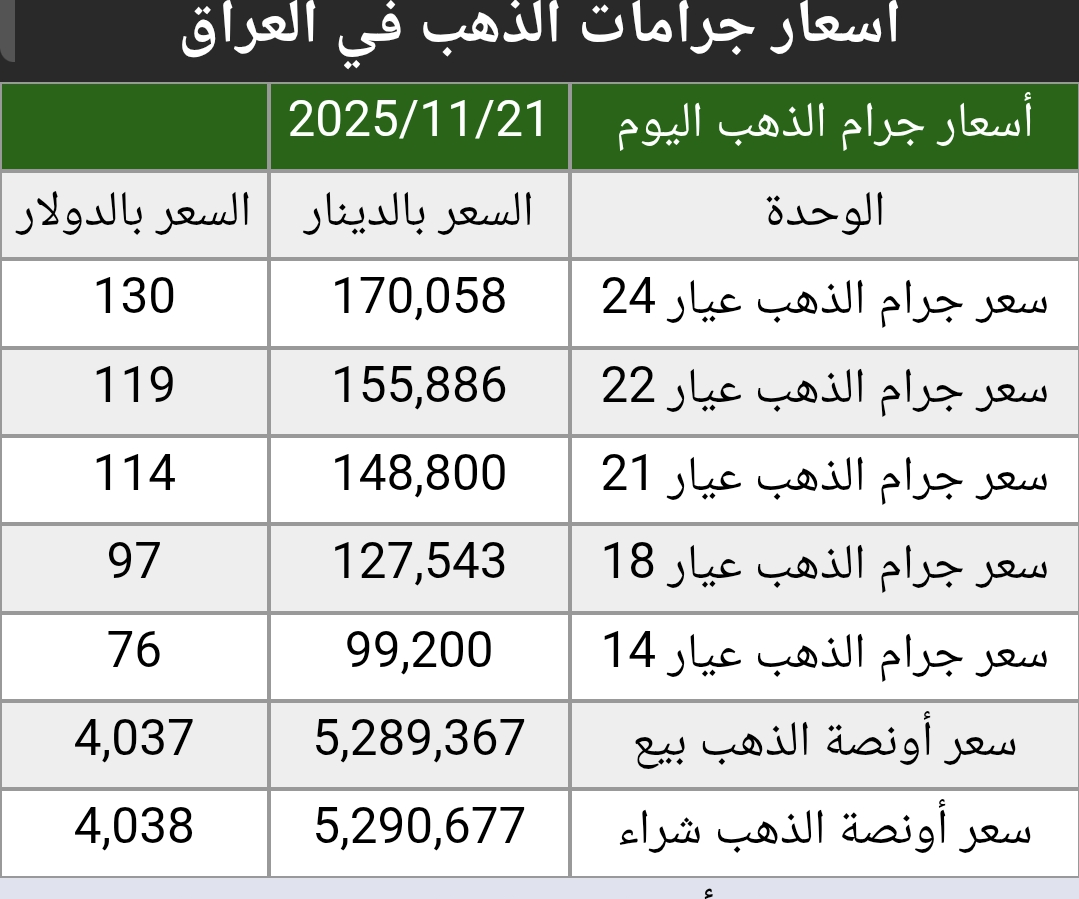 أسعار الذهب في العراق اليوم 21 نوفمبر 2025 شهدت تحركات هادئة لكنها تأثرت بانخفاض سعر الأونصة عالميًا. ورغم هذا التراجع، تبقى سوق الذهب العراقية نشطة خصوصًا في فئات الجرامات الأكثر تداولًا مثل عيار 21 وعيار 18، وكذلك السبائك الصغيرة التي يفضلها المستثمرون.