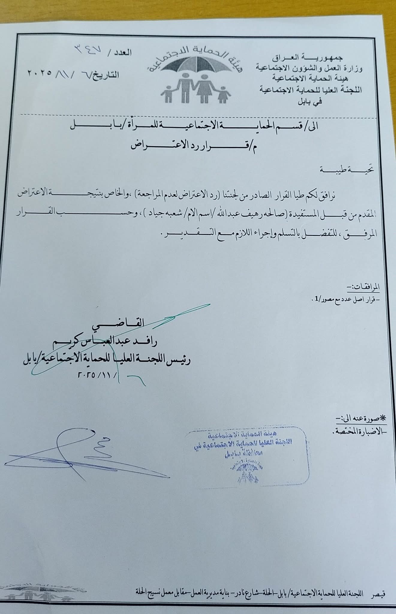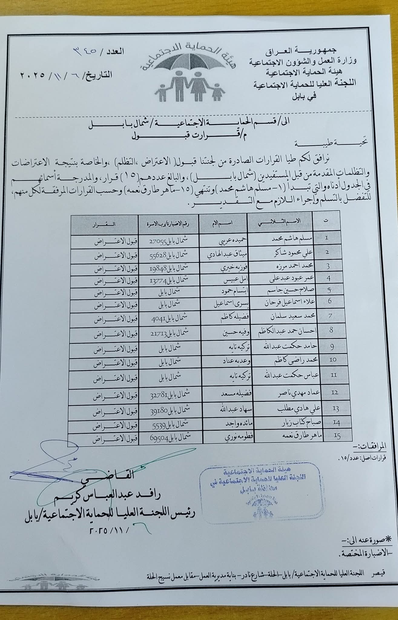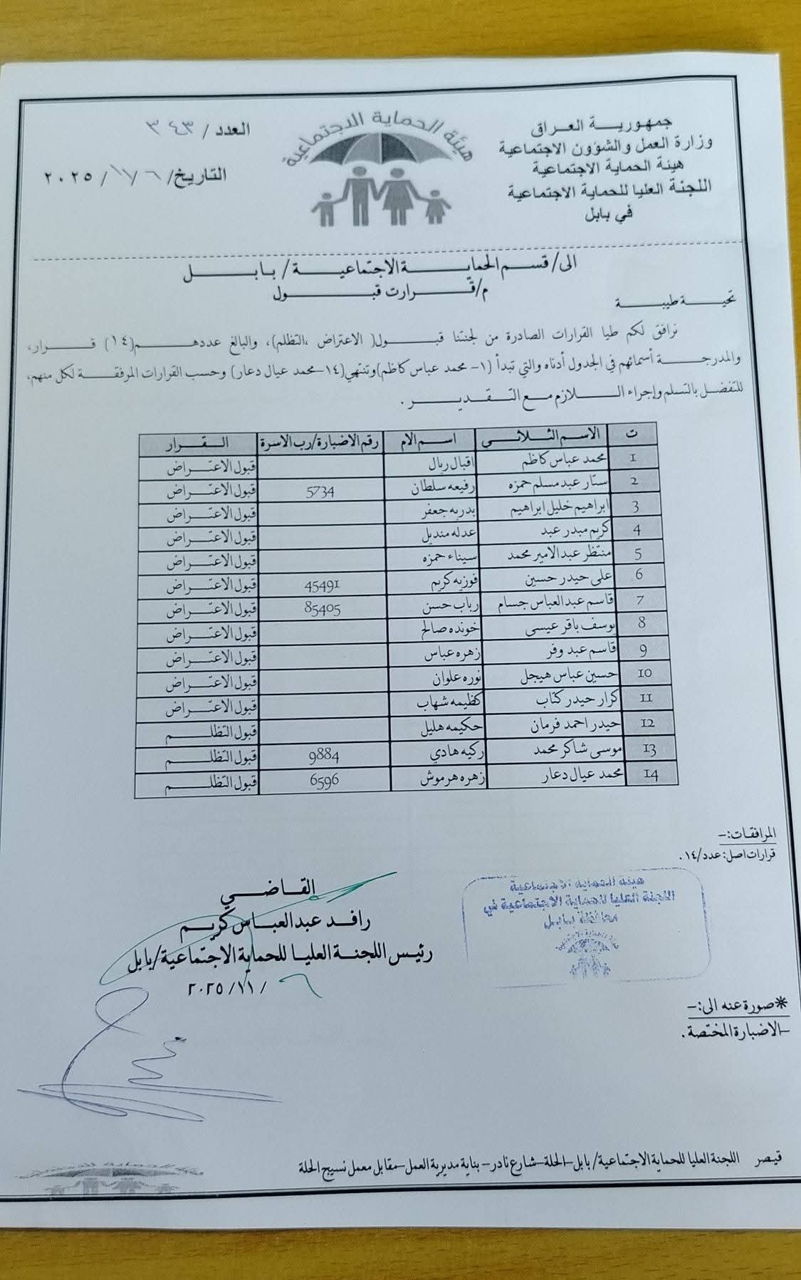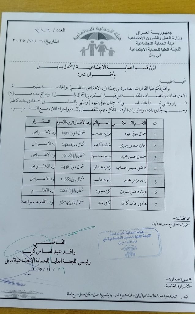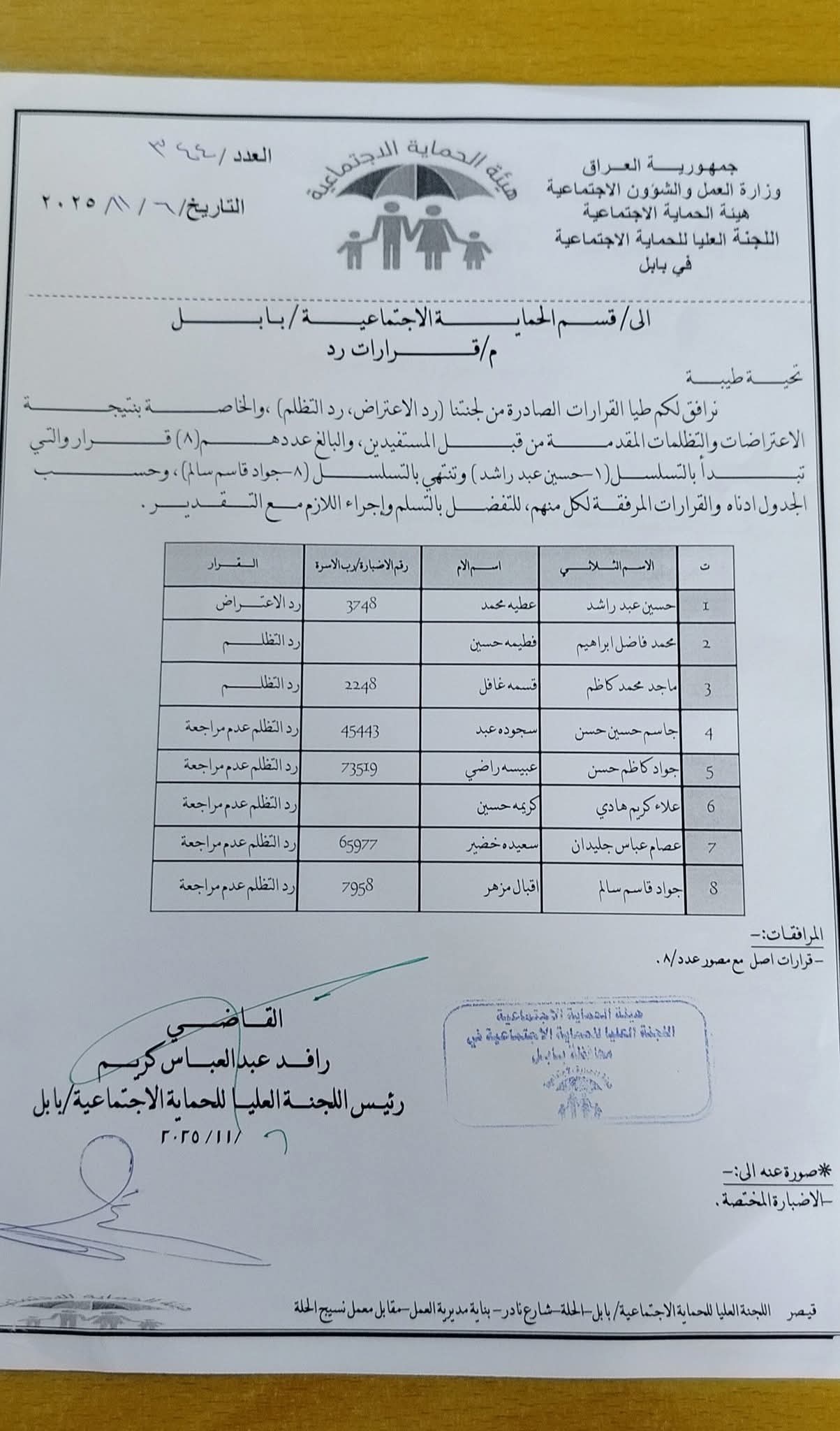 ودعت اللجنة جميع المواطنين الذين ظهر اسمهم ضمن القرارات—سواء كانوا من المقبولين أو المرفوضين—إلى مراجعة قسم الحماية الاجتماعية للرجال في بابل/ شمال بابل لغرض استكمال الإجراءات المطلوبة.