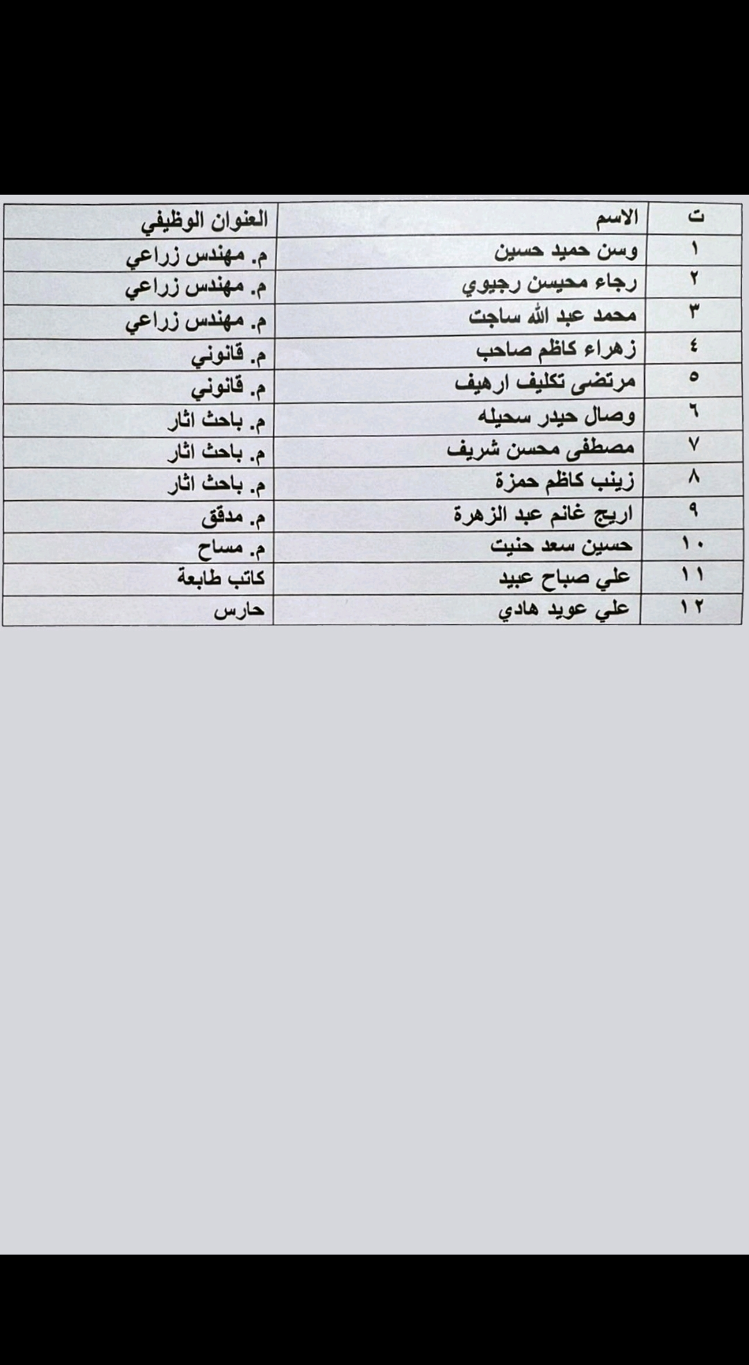 ودعت المحافظة الأسماء الواردة في القوائم المرفقة، والتي تم تثبيت العناوين الوظيفية أمام كل اسم، إلى الحضور لغرض المباشرة يوم الأحد الموافق 21/12/2025، إلى مبنى الإدارة العامة والمحلية / قسم الموارد البشرية – شعبة الملاك والتوظيف.